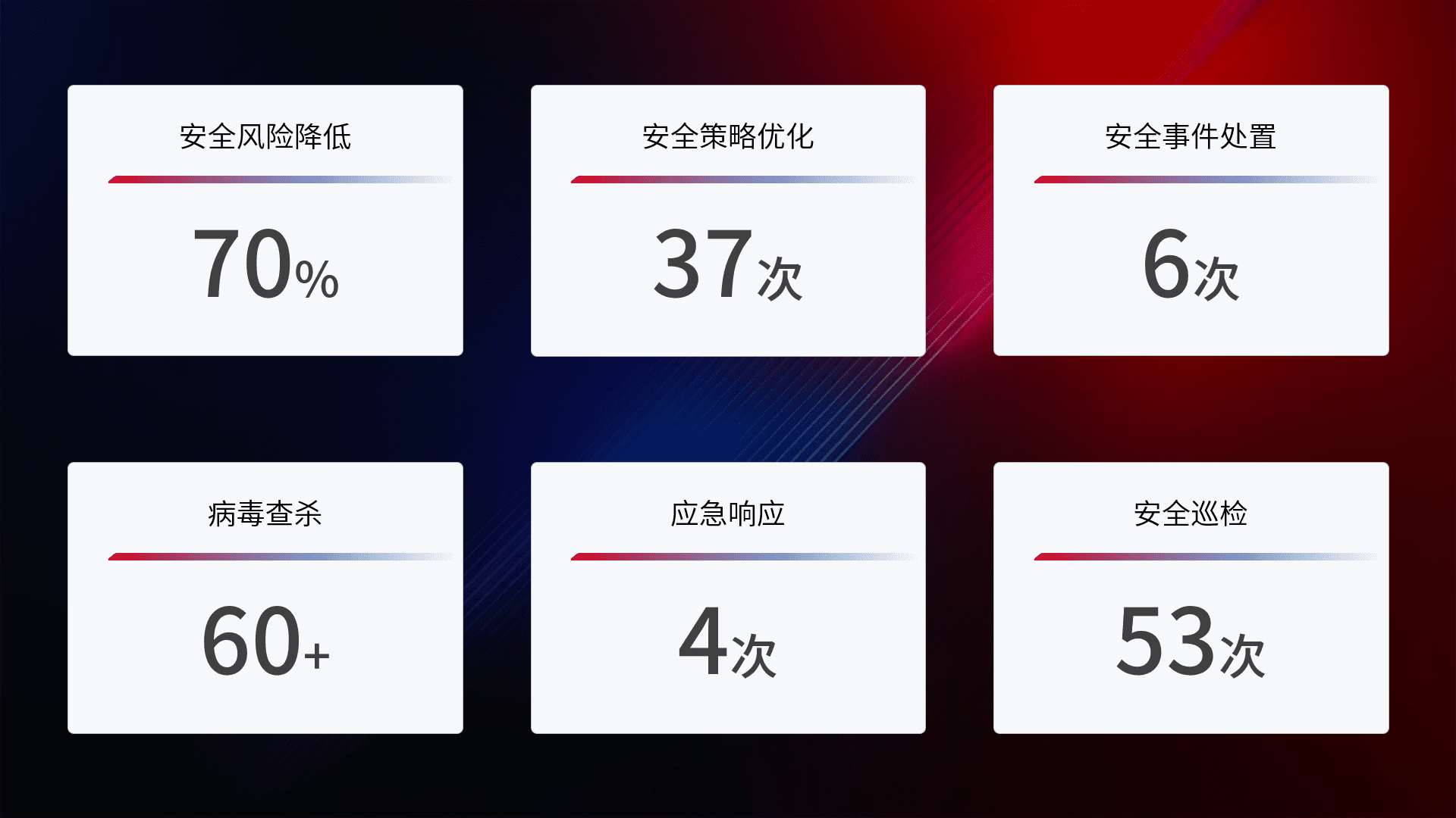 提供全面的安全事件报告体系,,包括处置报告、、、、周报、、季度和年度总结,,结合持续监控,,,帮助客户深入了解网络安全状况。。